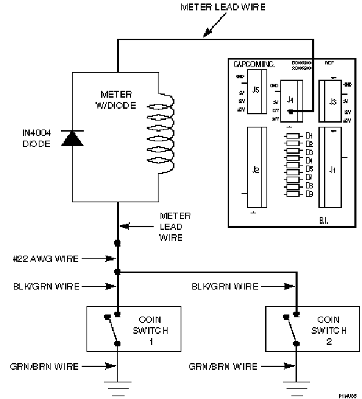 DATE: DECEMBER 6, 1995 SUBJECT: MECHANICAL COIN METER TO: ALL DISTRIBUTORS GAME: MAGICÔ REASON FOR BULLETIN: MECHANICAL COIN METER INSTALLATION. AFFECTS S/N’s: ALL S/N’s PARTS NEEDED: 1 6-DIGIT, NON-RESETTABLE METER, CAPCOM P/N CT00100 RATED AT 12 VDC, WITH A 1N4004 CLAMPING DIODE. 1 .156, 22AWG, 5 PIN CONNECTOR. 1 #22 AWG YELLOW WIRE 48" LONG. INSTALLATION INSTRUCTIONS: * CONNECT ONE SIDE OF THE METER TO PIN 2 OF A 5 PIN CONNECTOR. CONNECT THIS CONNECTOR TO J4 PIN 2 ON THE DIODE PCB. * CONNECT THE OTHER SIDE OF THE METER TO THE 48" LEAD. * RUN THE WIRE WITH THE HARNESS WHICH IS LOCATED ON THE LEFT SIDE OF THE CABINET, THROUGH THE PROTECTIVE SLEEVE BY THE COIN DOOR HINGE. * CRIMP OR SOLDER THE WIRE END TO THE EXISTING LUG LOCATED AT THE BOTTOM OF THE COIN SWITCH. * MOUNT THE METER ON THE INSIDE OF THE LOWER CABINET, TO THE LEFT SIDE OF THE CASH BOX, ON THE WOOD PORTION JUST BEHIND THE CASH BOX.